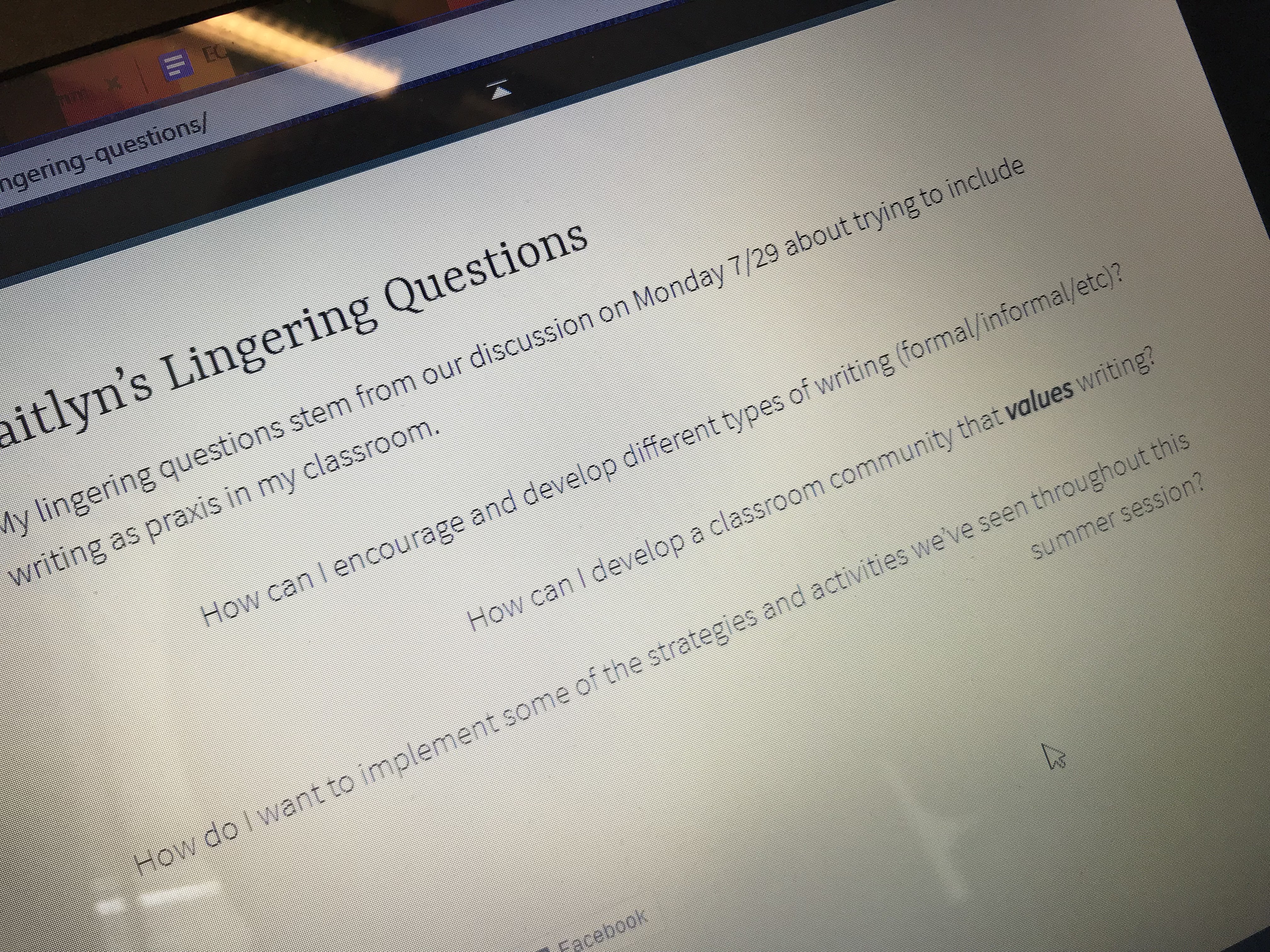 CAITLYN: So, Caitlyn went first. Her question was… How to get kids to engage in writing groups and use descriptive language when expressing their thoughts about peers writing. Caitlyn explained how she was working to use writing groups with her middle school students. She learned that students want to share ideas about their writing, but their awkward middle school hormonal ways often get in the way of sharing the way most teachers would like. Overall, it was clear that her middle school writing groups have not yet managed to live up to the brilliance that Dan and Sierra bring to her writing group.